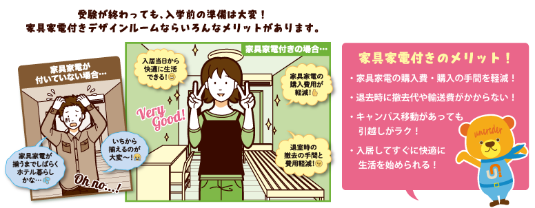 引越し代や家具家電の購入費用・手間・時間、卒業後の廃棄料などを大幅に軽減!